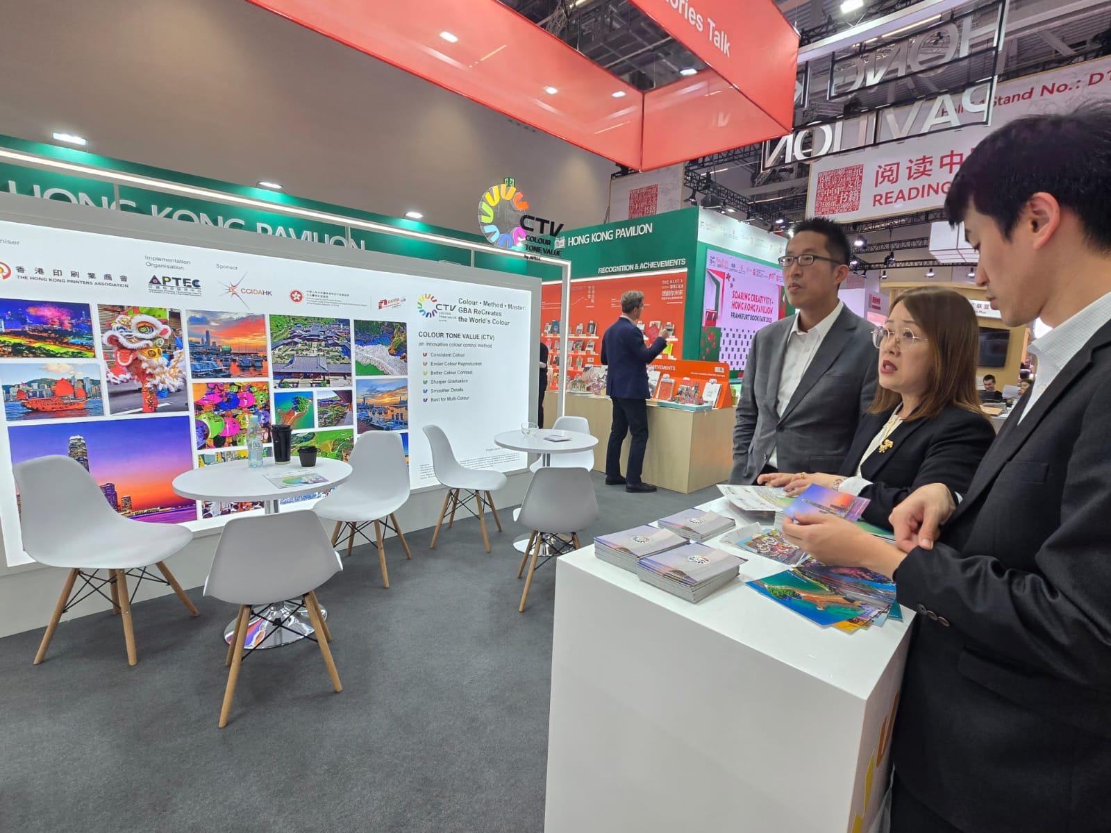 在本次法蘭克福書展上,香港館內首次設立了CTV項目專門的宣傳展區。展示區內主要通過兩種形式向參觀者呈現技術效果:一是通過現場屏幕循環播放以往參與過CTV技術培訓的公司的訪談與反饋,同時APTEC高級技術專員林冬南先生也在現場互動詳細講解CTV的技術內容。二是現場派發了採用CTV技術印刷的明信片,呈現鮮明色彩對比、平滑漸變過渡與豐富的細節層次,使每一位獲取者都能近距離感受CTV技術的實際效果。